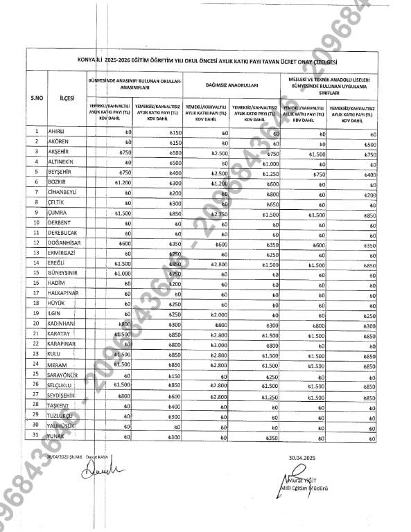 nasınıfı bulunan okul/kurumlarda eğitim gören okul öncesi öğrencilerinden alınacak 2025-2026 eğitim öğretim yılı aylık tavan ücret miktarına ilişkin ilgi Valilik Oluru